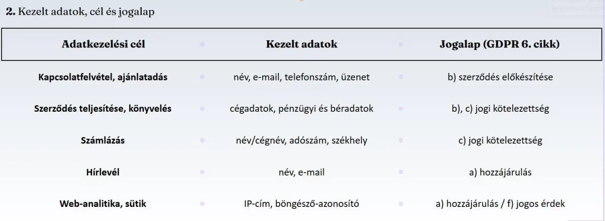 Célhoz kötöttség: adatot csak előre meghatározott, egyértelmű és jogszerű célra gyűjtünk és használunk fel.